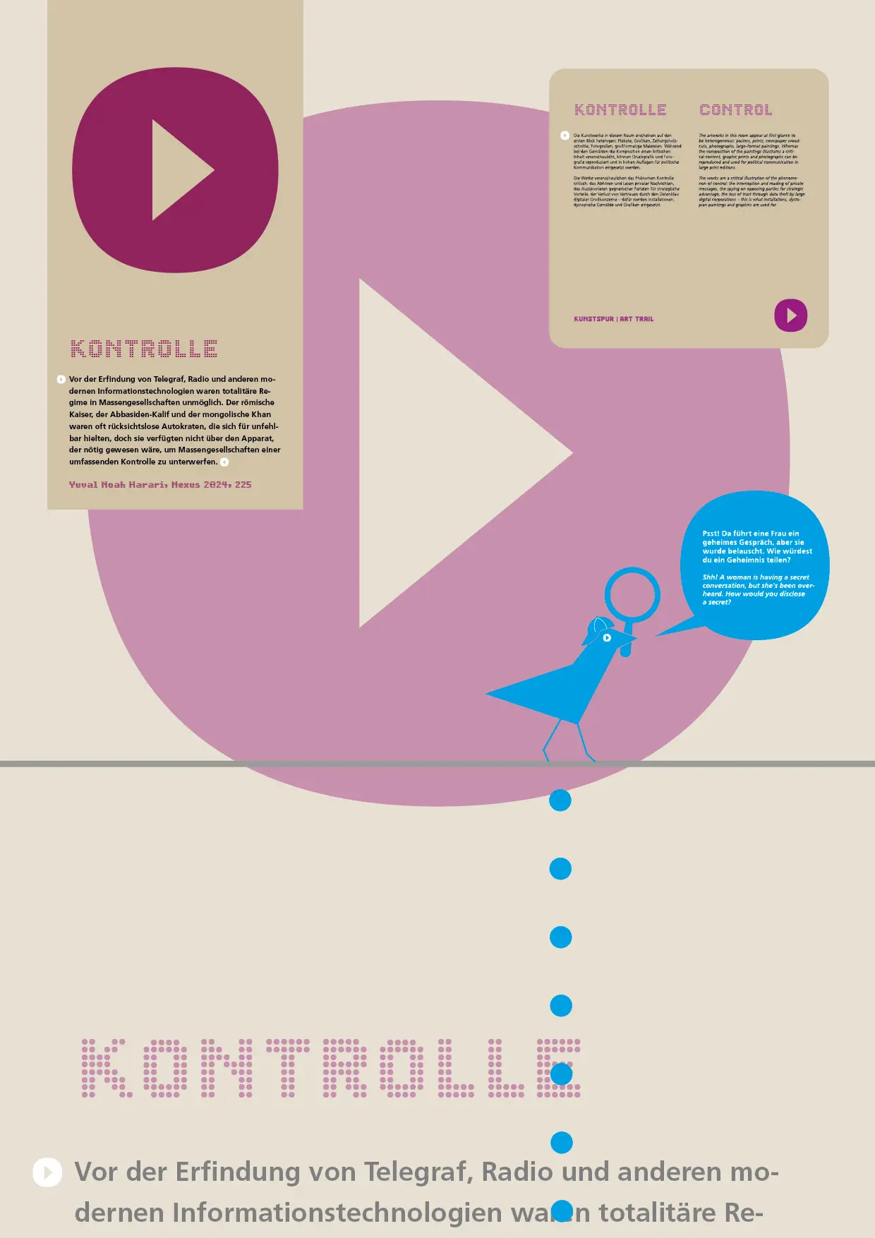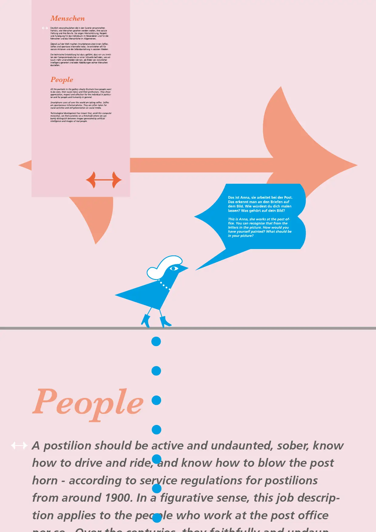 Based on the four thematic areas of the permanent exhibition, I worked with studio otenso to develop a visual guidance system based on different graphic arrows. These appear in six color combinations and guide visitors through the exhibition rooms on flags, posters and object panels. Individual arrow variants — symbolizing movement, communication and networking — were developed for each of the six content areas.